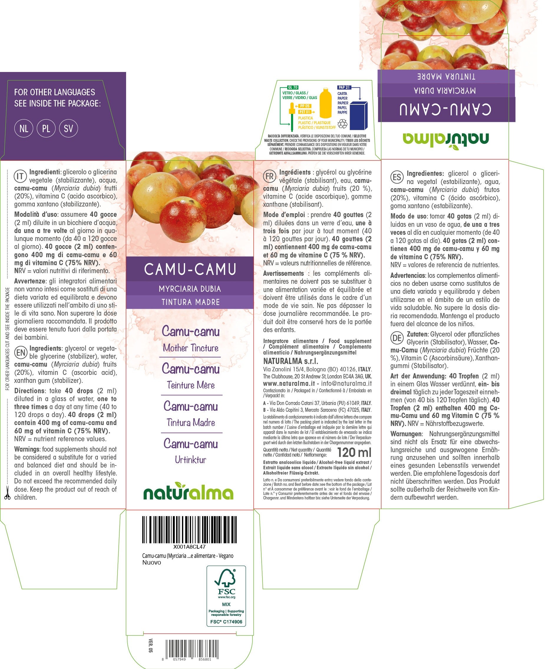 40 gocce (2 ml) contengono 400 mg di camu-camu e 60 mg di vitamina C (75% NRV). NRV = valori nutritivi di riferimento.
