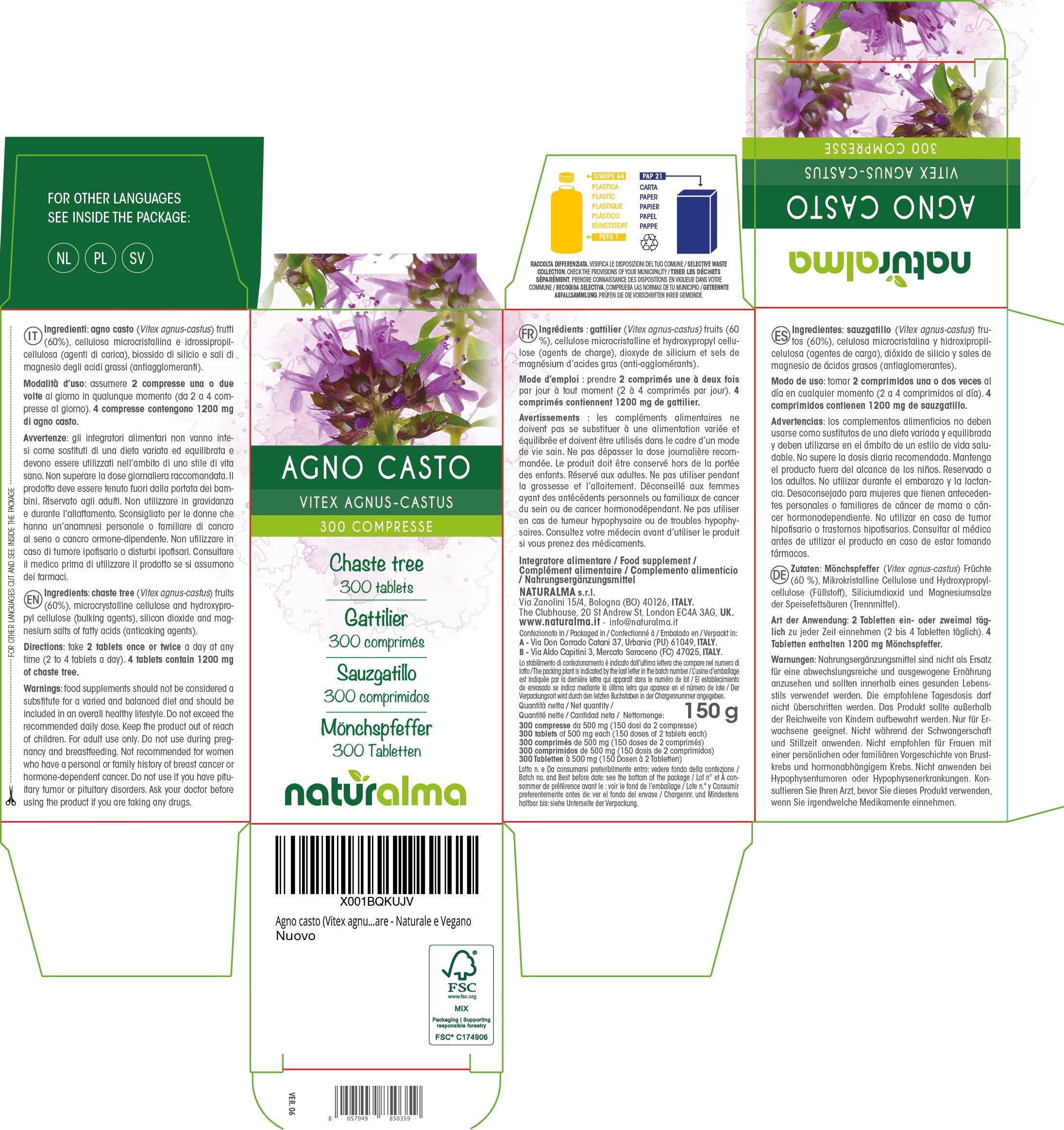 Niepokalanek pospolity (Vitex agnus-castus) owoce (60%), celuloza mikrokrystaliczna i hydroksypropyloceluloza (substancje wypełniające), dwutlenek krzemu i sole magnezowe kwasów tłuszczowych (substancje przeciwzbrylające).